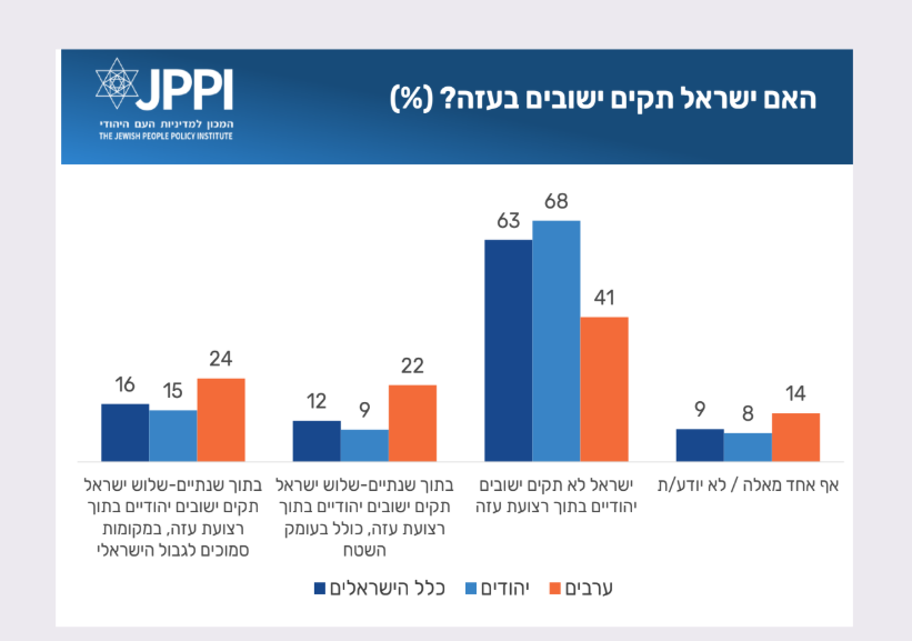 אחת השאלות הנפיצות ביותר בסקר עסקה בעתיד ההתיישבות היהודית ברצועת עזה. הרוב המכריע של הישראלים (63%) מעריכים שישראל לא תקים יישובים יהודיים בעזה. רק מיעוט, אמנם לא מבוטל, (כ-28%) חושבים שישראל תחדש התיישבות-בין אם בסמוך לגבול ובין אם בעומק הרצועה. באופן מעניין, דווקא בקרב האזרחים הערבים בישראל, שיעור האמונה שיוקמו יישובים יהודיים (46%) גבוה מזה שבקרב היהודים (24%).