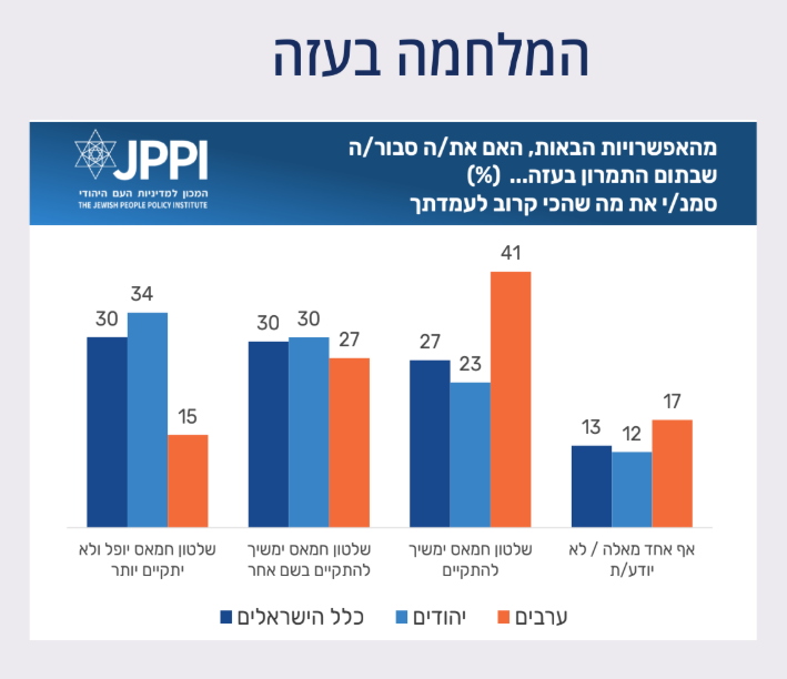 פרופ' שטרן הוסיף: "נתוני הסקר משקפים חברה ישראלית שאמנם ממשיכה לתמוך בפעולה הצבאית, אך גם מפתחת סקפטיות גוברת באשר לתוצאה הרצויה. חלק מהציבור כבר לא מאמין שניתן להפיל את חמאס, ומניח שישראל תישאר עמוק בתוך עזה לתקופה ממושכת. הציבור היהודי מודאג באשר למחיר המוסרי שהלחימה גובה מאתנו, בעוד שאצל האזרחים הערבים-יש תחושת ניכור גוברת. הממצאים מחייבים בחינה לא רק של התוכנית הצבאית-אלא גם של האופק המדיני והתודעתי שנוצר בעקבותיה".