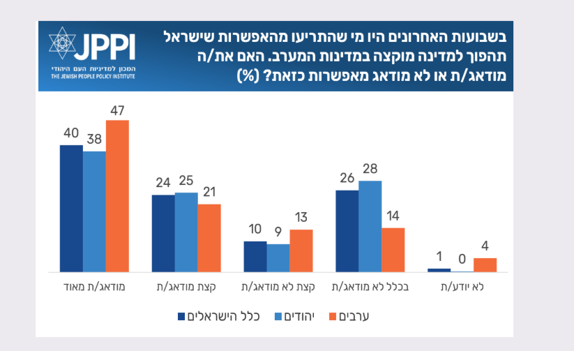לצד ההתמקדות בעזה, הסקר בדק גם את הלך הרוח הציבורית בנוגע לאפשרות שישראל תהפוך ל"מדינה מוקצה" במערב. כ-64% מהציבור הביעו דאגה-מלאה או חלקית-מהאפשרות הזו. מתוכם, 40% מהישראלים אמרו שהם "מודאגים מאוד". אפילו בקרב חלק מתומכי הימין-נרשמה רמת דאגה לא מבוטלת, אם כי היא נמוכה יחסית לשאר המחנות הפוליטיים.