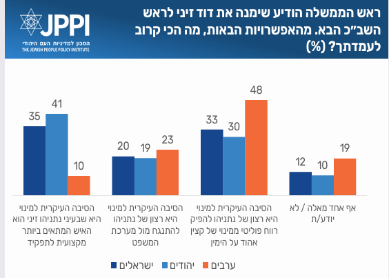 לפי הסקר, 35% מהישראלים סבורים כי ראש הממשלה בנימין נתניהו בחר בזיני משום שהוא רואה בו את המועמד המתאים ביותר מבחינה מקצועית. לעומתם, 33% סבורים שהמינוי נובע מרצון פוליטי להרוויח מהפופולריות של זיני בקרב הימין, ו־20% מאמינים שמדובר במהלך שנועד להתנגח במערכת המשפט.