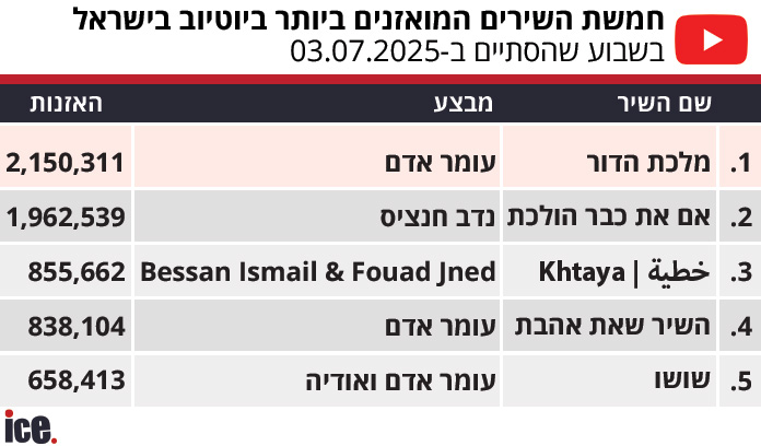 דירוג יוטיוב של ice שמציג את נתוני ההאזנות בשבוע החולף, מראה יציבות בצמרת האמנים הישראלים המושמעים, וכניסה חדשה היישר למקום השני ברשימת השירים המושמעים ביותר.