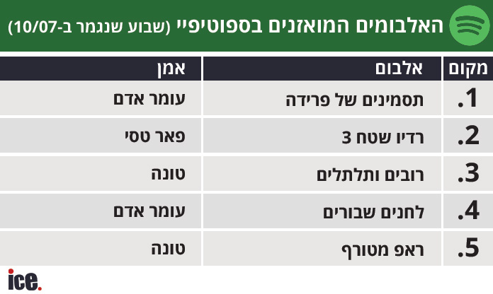 שני היוצרים האהובים מתחלפים במקומות, בזמן שעומר אדם שומר על הניצוץ. כמה שירים הוא הצליח להכניס לרשימה הפעם?