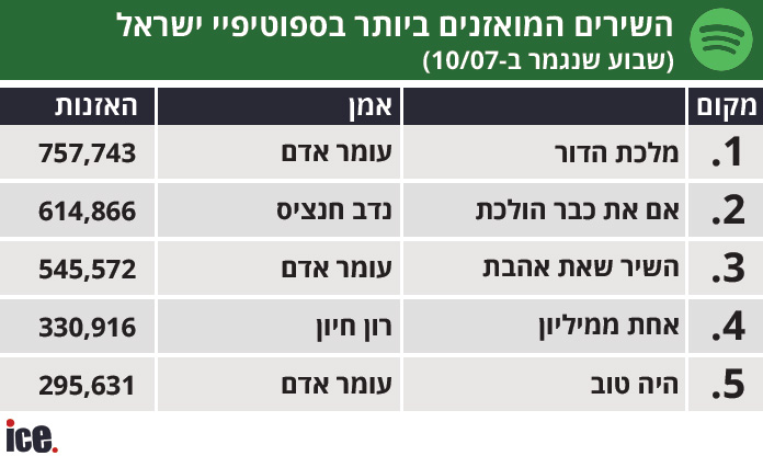 רון חיון ממשיך להסתכל על אדם וחנציס מלמטה, עם הלהיט "אחת ממיליון" שהגיע לקצת יותר מ-330,000 האזנות. אדם מכניס שיר נוסף לחמישייה, עם "היה טוב" שנועל את רשימת 5 השירים המואזנים ביותר.