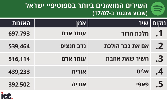 כבכל שבוע, הדירוג של "ספוטיפיי ישראל" חושף תמונת מצב עדכנית של מעמדם של האומנים בישראל. בשבוע האחרון, הזמר עומר אדם שמור על מקומו כזמר הפופולרי ביותר בישראל.