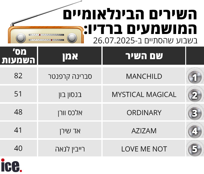 עומר אדם שומר על מקומו בפסגת האמנים המושמעים של תחנות הרדיו, אייל גולן בעקבותיו ואודיה במקום השלישי, בקרב האמנים הבינלאומיים סברינה קרפנטר חולפת על פני קולדפליי וכובשת את המקום הראשון