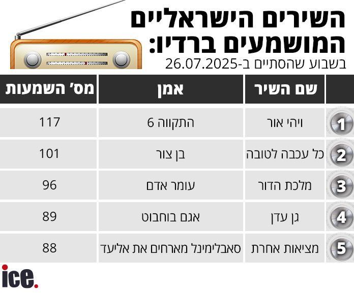 את רשימת השירים הישראלים המושמעים ביותר בשבוע שחלף מוביל "ויהיה אור" של התקווה 6 עם 117 פעמים שהושמע בתחנות הרדיו. במקום השני נמצא "כל עכבה לטובה" של בן צור עם 101 השמעות. במקום השלישי "מלכת הדור" של עומר אדם עם 96 השמעות, לפני "גן עדן" של אגם בוחבוט עם 89 השמעות. "מציאות אחרת" של סאבלימינל ואליעד סוגר את החמישייה עם 86 השמעות.