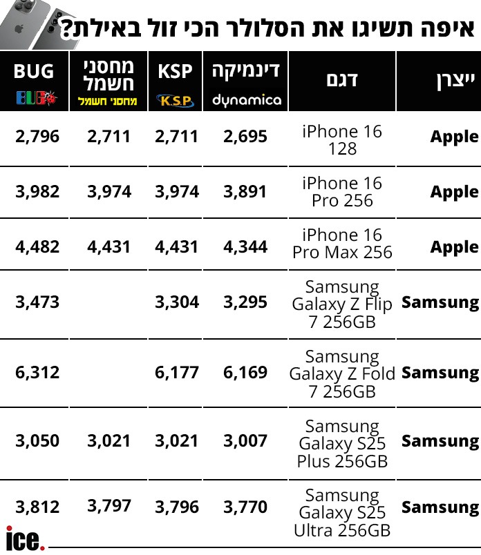 המחירים של האייפונים החדשים כמו גם דגמי גלקסי של סמסונג, יכולים להגיע למחירים גבוהים במרכזי הערים, וגם בעיר אילת ייתכן פערים בין המקומות השונים, שיכול להגיע גם עד כ-200 שקלים. המחירים שבדקנו אמנם צמודים, אבל בכל זאת - יש מקום אחד שבאופן מפתיע, ניצח בכל הקטגוריות עם המחיר הזול ביותר בכל המכשירים.