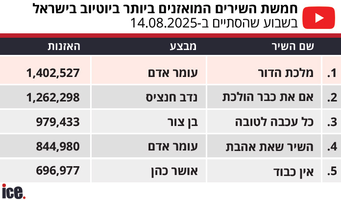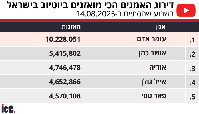 עומר אדם כבש את אצטדיון רמת גן וגם את דירוג יוטיוב של ice בשבוע האחרון בפער ענק. מייד אחריו, גם להם יש חלק בהופעות שהתקיימו השבוע, אושר כהן ואודיה אזולאי שתפסו את המקומות השני והשלישי בהתאמה. אייל גולן ניצב במקום הרביעי ומי שסוגר את הרשימה המובילה הוא פאר טסי.