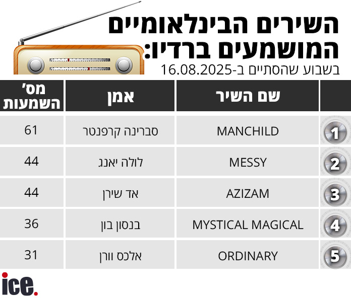 "MANCHILD" של סברינה קרפנטר מובילה את גזרת השירים הבינלאומיים המושמעים בתחנות הרדיו עם 61 השמעות. בצוותא במקום השני, להיט הטיקטוק, "MESSY" של לולה יאנג ו-"AZIZAM" של אד שירן עם 44 השמעות.