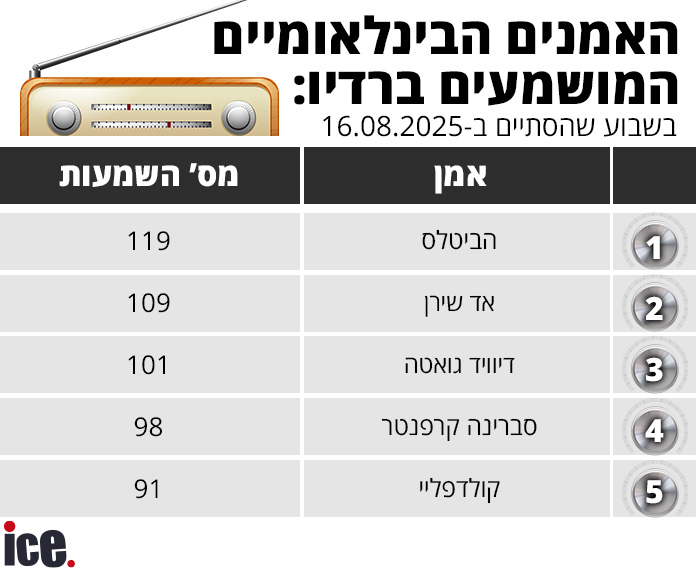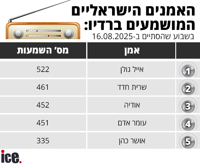 מסכמים שבוע בדירוג תחנות הרדיו של ice. בגזרת האמנים הישראלים המושמעים ברדיו מנצח אייל גולן עם 522 השמעות בשבוע האחרון.