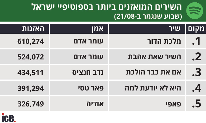 עומר אדם ממשיך לשמור על הפסגה בדירוג האמנים הישראלים המושמעים ביותר בספוטיפיי בשבוע האחרון. אדם ממשיך לשמור על המקום הראשון, אולם בדירוג חל מספר שינוי מעניינים. פאר טסי שבדירוג הקודם היה במקום הרביעי ועבר את אודיה שירדה למקום השלישי, אושר כהן נשאר במקום הרביעי ואייל גולן סוגר את החמישייה הראשונה.