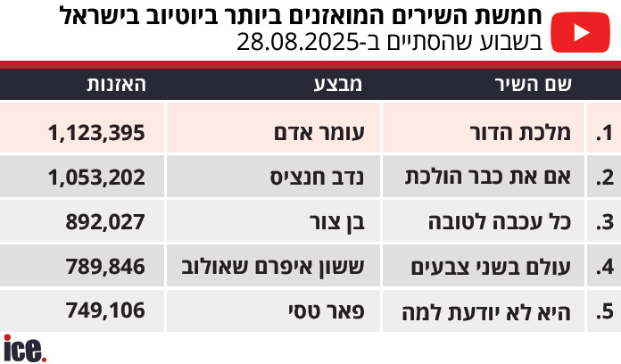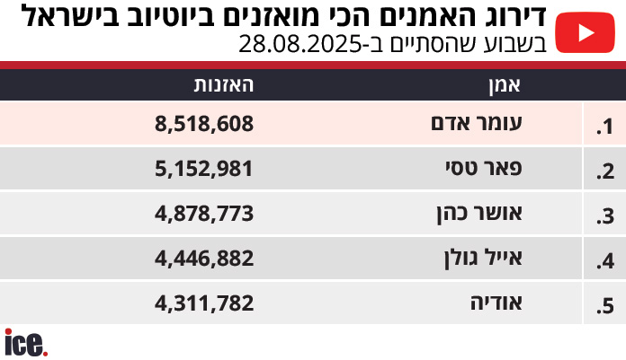 עומר אדם ממשיך לשלוט בדירוג היוטיוב השבועי של ice. אדם ממשיך את השליטה האבסולוטית שלו בפלטפורמה המושמעת ומוביל את רשימת הזמרים המואזנים ביותר בשבוע שחלף ביוטיוב ישראל עם יותר מ-8.5 מיליון האזנות, הרבה לפני פאר טסי שבמקום השני עם 5.1 מיליון האזנות, אושר כהן שלישי עם 4.8 מיליון האזנות.
