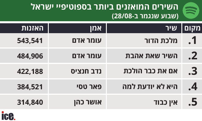 את רשימת השירים המואזנים ביותר בספוטיפיי פותח "מלכת הדור" של עומר אדם עם יותר מ-543 אלף האזנות והוא מקדים שיר נוסף של אדם, "השיר שאת אהבת" עם יותר מ-484 אלף האזנות. במקום השלישי "אם את כבר הולכת" של נדב חנציס עם יותר מ-422 אלף האזנות. "היא לא יודעת למה" של פאר טסי במקום הרביעי עם יותר מ-384 אלף האזנות ו-"אין כבוד" של אושר כהן סוגר את החמישייה הראשונה עם 314 אלף האזנות.