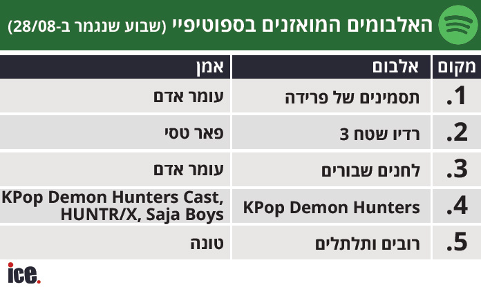 את רשימת האלבומים המואזנים מוביל "תסמינים של פרידה" של עומר אדם, במקום השני "רדיו שטח 3" של פאר טסי, במקום השלישי "לחנים שבורים" של עומר אדם, KPOP DEMON HUNTERS במקום הרביעי ואת החמישייה המוביל משלים "רובים ותלתלים" של טונה.