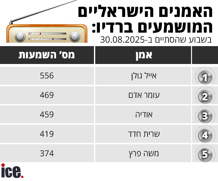 שבוע חדש נפתח עם דירוג תחנות הרדיו של ice. אייל גולן שהודיע השבוע על ההופעות הקרובות בפארק הירקון הושמע במהלך השבוע 556 פעמים, מייד אחריו עומר אדם עם 469 השמעות בתחנות הרדיו בשבוע האחרון.