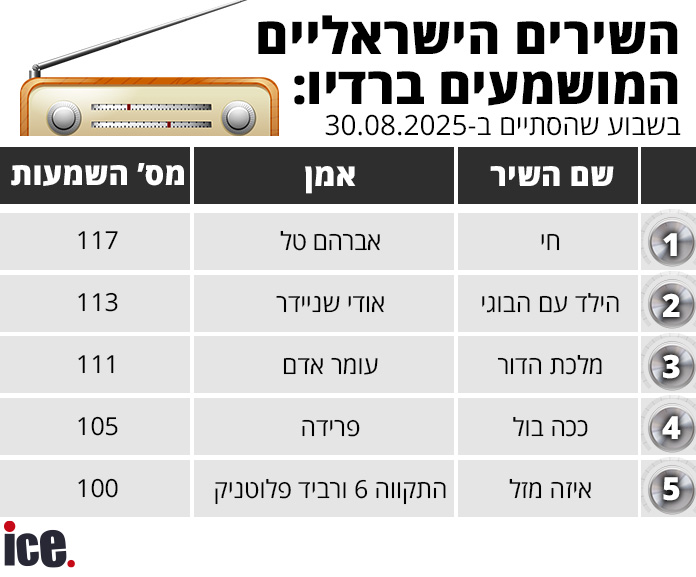בגזרת השירים הישראליים שהושמע בתחנות הרדיו בשבוע האחרון הוא הלהיט החדש של אברהם טל "חי" שהושמע 117 פעמים. זו בשורה שנייה משמחת בתחילת השבוע עבור טל, לאחר שהוא ואשתו שלומית הודיעו כי הפילאטיס מכשירים החדש שלהם ייפתח רשמית מחר (שני).
