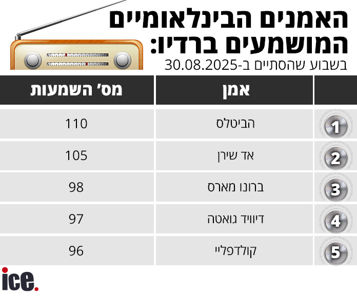 בגזרת האמנים הבינלאומיים המושמעים ביותר בכל תחנות הרדיו, במקום הראשון הביטלס עם 110 השמעות, מייד אחריו, הזמר הבריטי האהוב, אד שירן עם 105 השמעות.