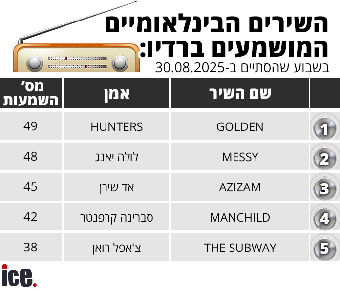 בגזרת השירים הבינאלומיים המושמעים בתחנות הרדיו השונות יש קרב אדיר על המקום הראשון. "GOLDEN" של "HUNTERS" עם 49 השמעות, בפער של השמעה הלהיט שכבש את הטיקטוק "MESSY" של לולה יאנג עם 48 השמעות במקום השני.