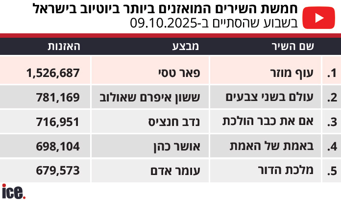 דירוג היוטיוב של ice מציג שינוי קל בצמרת האמנים המושמעות ביותר בשבוע שחלף. פאר טסי עוקף את עומר אדם ועולה לפסגת האמנים המושמעים ביותר עם יותר מ-5.8 מיליון השמעות. עומר אדם כאמור במקום השני עם 91 השמעות פחות בלבד.