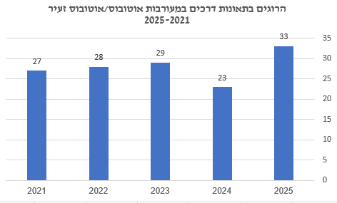 השנה עוד לא הסתיימה, ומספר ההרוגים בתאונות דרכים שבהן מעורבים אוטובוסים ואוטובוסים זעירים כבר עבר את כל נתוני 2024. לפי עמותת אור ירוק ונתוני הרלב"ד, מתחילת 2025 נהרגו 33 בני אדם בתאונות מסוג זה, לעומת 23 הרוגים בשנה כולה אשתקד – עלייה של 43%.