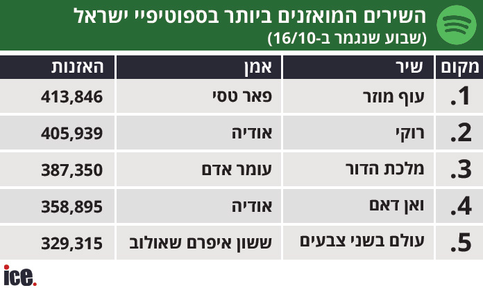 דירוג ספוטיפיי מציג שינוי קל בצמרת האמנים המושמעים ביותר: עומר אדם שומר על מקומו כאמן המושמע ביותר בספוטיפיי ישראל. מיד לאחר מכן נמצאים פאר טסי, אודיה ואושר כהן. השינוי המשמעותי הוא באומן שסוגר את החמישייה הראשונה, לאחר שבוע בו פרצה טיילור סוויפט אל הצמרת, אייל גולן מדיח אותה מרשימת האמנים המושמעים ביותר.