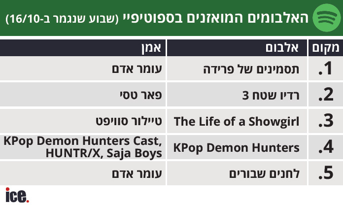 עומר אדם שומר על מעמדו כזמר המושמע ביותר בספוטיפיי ישראל, גם בשבוע שחלף, לאחר שבוע של נציגות בינלאומית בחמישייה הראשונה, אייל גולן דוחק את טיילור סוויפט אל מחוץ לחמישייה