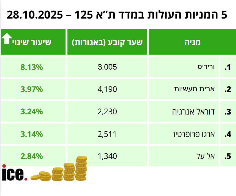 במסגרת 5 המניות העולות הבולטות ביותר במקום הראשון נמצאת מניית ורידיס כאשר היא ממשיכה עם הזינוק שלה מאתמול ועולה למקום הראשון כאשר עליה ב8.13% העלתה אותה לרמה של 3005 אגורות.