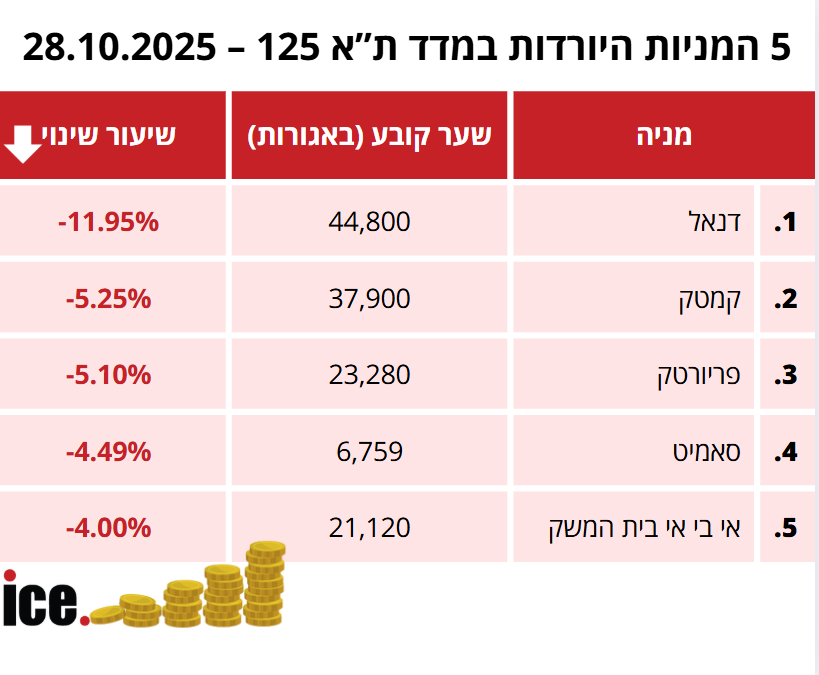 במסגרת 5 המניות היורדות נמצאת במקום הראשון מניית דנאל שרושמת צניחה של -11.95% לרמה של 44,800 אגורות, במקום השני קמטק עם ירידה של -5.25% לרמה של 37,900 אגורות, במקום השלישי נמצאת פריורטק שירדה ב-5.10% לרמה של 23,280 אגורות, רביעית נמצאת סאמיט שירדה ב-4.49% לרמה של 6,759 אגורות, חמישית איביאי בית השק ירדה ב-4.00% לרמה של 21,120 אגורות.