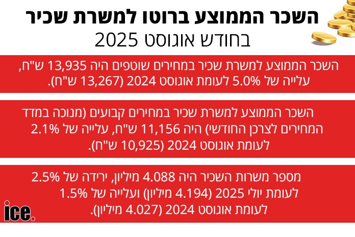 מספר משרות השכיר היה 4.088 מיליון, ירידה של 2.5% לעומת יולי 2025 (4.194 מיליון) ועלייה של 1.5% לעומת אוגוסט 2024 (4.027 מיליון). בחודש אוגוסט 2025 המגזר הגדול ביותר היה מגזר החברות הלא-פיננסיות, ובו היו 2.613 מיליון משרות שכיר (63.9% מכלל משרות השכיר במשק). השכר הממוצע למשרת שכיר במגזר זה היה 15,317 שקל.