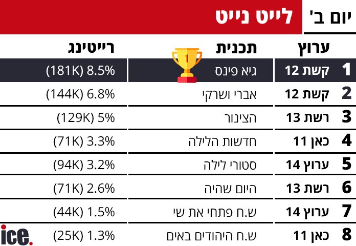 ברצועת הלייט הלילית, קשת 12 המשיכה את שליטתה. "גיא פינס" הוביל עם 8.5% נתח צפייה ו-181 אלף צופים, ואחריו "אברי ושרקי" באותו ערוץ עם 6.8% ו-144 אלף צופים. "הצינור" ברשת 13 השיג 5% נתח עם 129 אלף צופים, ואחריו "חדשות הלילה" בכאן 11 עם 3.3% ו-71 אלף צופים. "סטורי לילה" בערוץ 14 הגיע ל-3.2% עם 94 אלף צופים, ואחריו "היום שהיה" ברשת 13 עם 2.6% ו-71 אלף צופים. את הרצועה סגרו שתי תוכניות שבת: "פתחי את שי" בערוץ 14 עם 1.5% ו-44 אלף צופים, ו-"ש.ח היהודים באים" בכאן 11 עם 1.3% ו-25 אלף צופים.