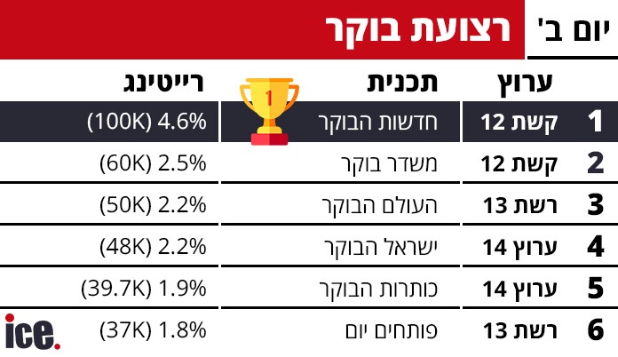 ברצועות הבוקר, "חדשות הבוקר" ברשת 13 הובילה עם 4.6% נתח צפייה ו-100 אלף צופים. "משדר בוקר" בהנחיית נסלי ברדה ויואב לימור בקשת 12 הגיע למקום השני עם 2.5% ו-60 אלף צופים, ואחריו "ישראל הבוקר" בערוץ 14 ו-"העולם הבוקר" בקשת 12 בשוויון עם 2.2% נתח - הראשון עם 48 אלף צופים והשני עם 50 אלף. "פותחים יום" ברשת 13 הגיע ל-1.8% עם 37 אלף צופים, ואילו "על הבוקר" בערוץ 14 סגר את רצועת הבוקר עם 1.1% נתח ו-28 אלף צופים בלבד.