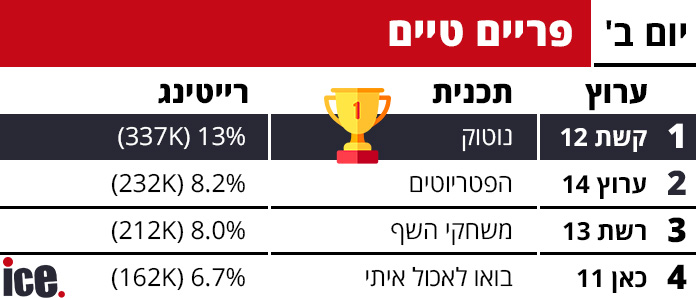 קשת 12 שולטת ביד רמה, ''נוטוק" הוביל את הפריים טיים עם 13% נתח צפייה ו-337 אלף צופים. "הפטריוטים" בערוץ 14 הגיע למקום השני עם 8.2% ו-232 אלף צופים