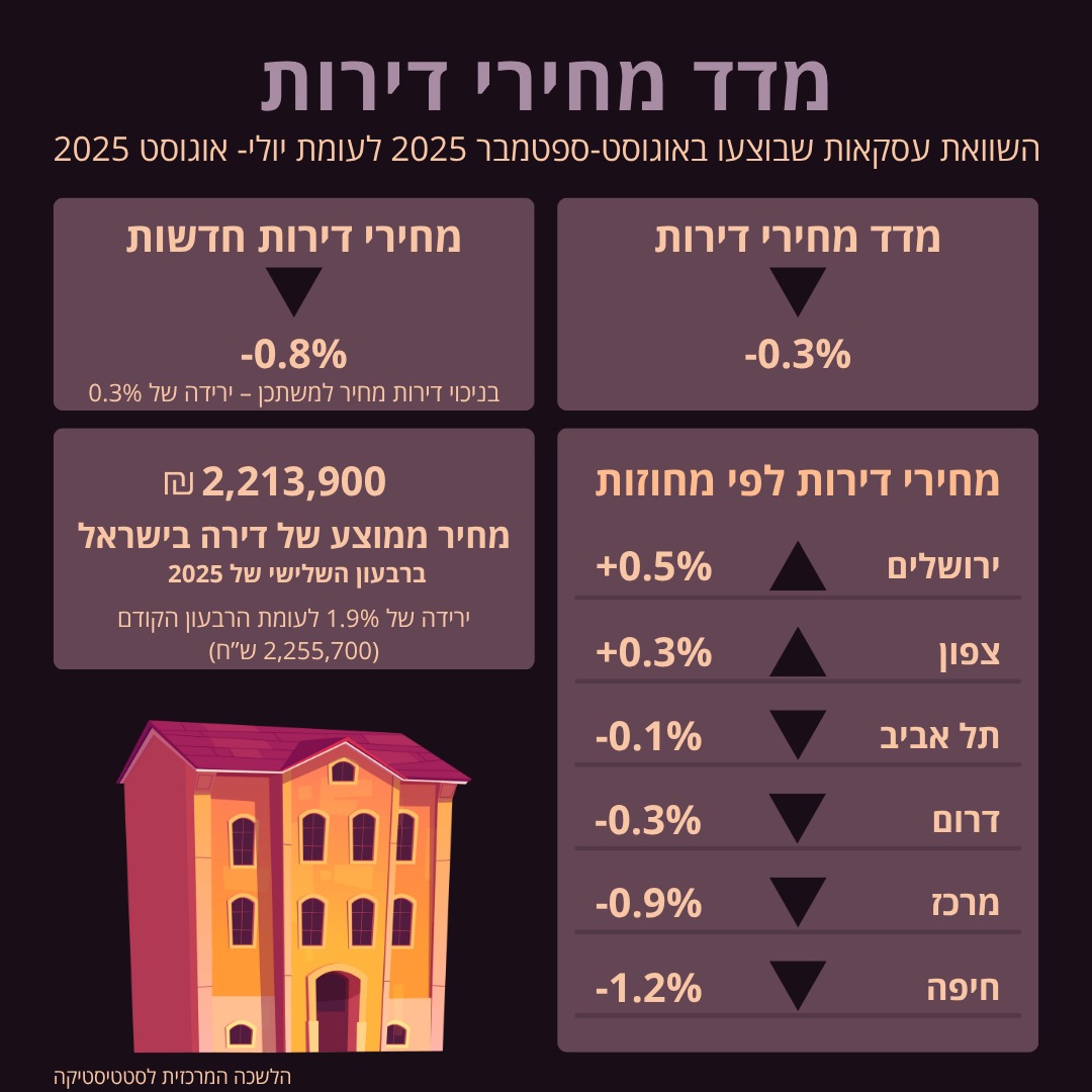 המחיר הממוצע הארצי של עסקאות (ללא ניכוי איכות) ברבעון השלישי של 2025 עמד על 2.213 מיליון שקל, ירידה של 1.9% לעומת הרבעון הקודם (2.255 מיליון שקל) וירידה של 2.5% לעומת הרבעון השלישי של 2024 (2.27 מיליון שקל).