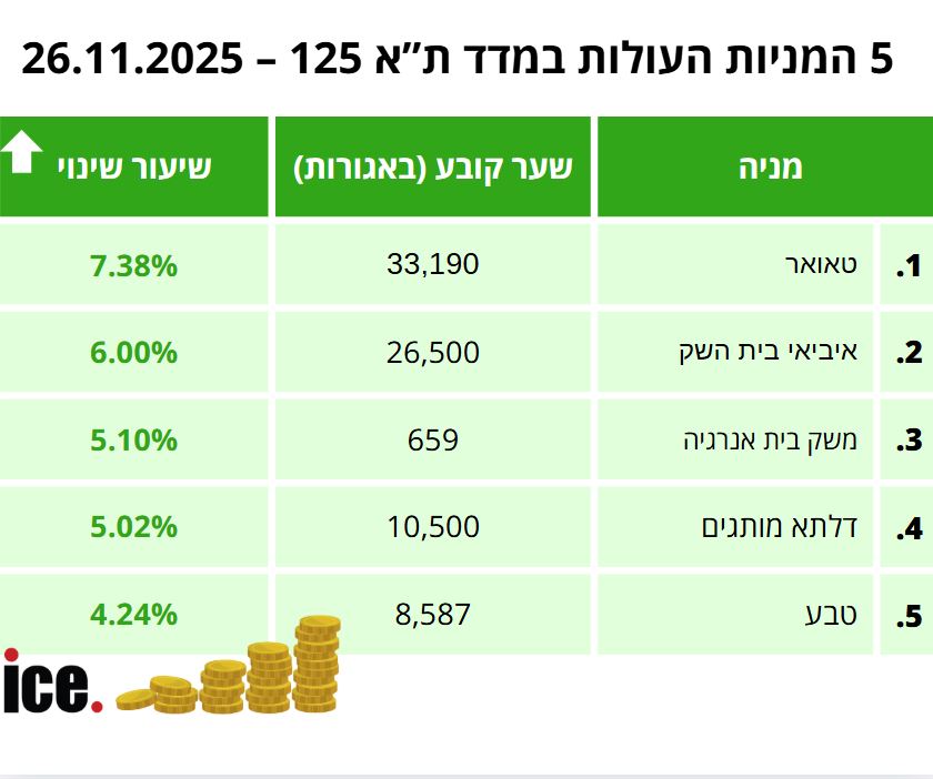במסגרת 5 המניות העולות הבולטות ביותר: במקום הראשון ניצבת מניית טאואר שזינקה ב- 7.38% לרמה של 33,190 אגורות. במקום השני מניית איביאי בית השק שקפצה ב-6.00% לרמה של 26,500 אגורות.
