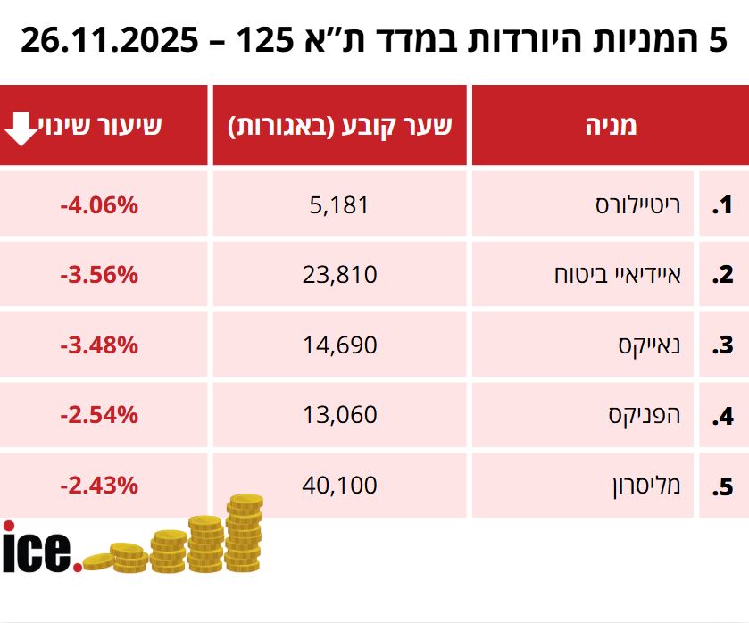 במקום השלישי נאייקס על ירידה של 3.48% לרמה של 14,690 אגורות. במקום הרביעי הפניקס עם ירידה של 2.54% לרמה של 13,060 אגורות, במקום החמישי מניית מליסרון עם ירידה של -2.43% לרמה של 40,100 אגורות.