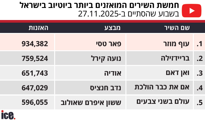 עומר אדם ממשיך לשלוט בדירוג היוטיוב של ice: הזמר ממשיך להיות המושמע ביותר ברשת החברתית, כאשר הוא ממשיך להוביל בגאון ולהסתכל על כולם מלמעלה. אולם גם השבוע כמו בשבועות קודמות חלה ירידה במספר ההשמעות, כאשר אדם מוביל על פניו של אייל גולן במיליון השמעות, עם יותר מ=5.6 מיליון לעומת 4.6 מיליון של גולן.