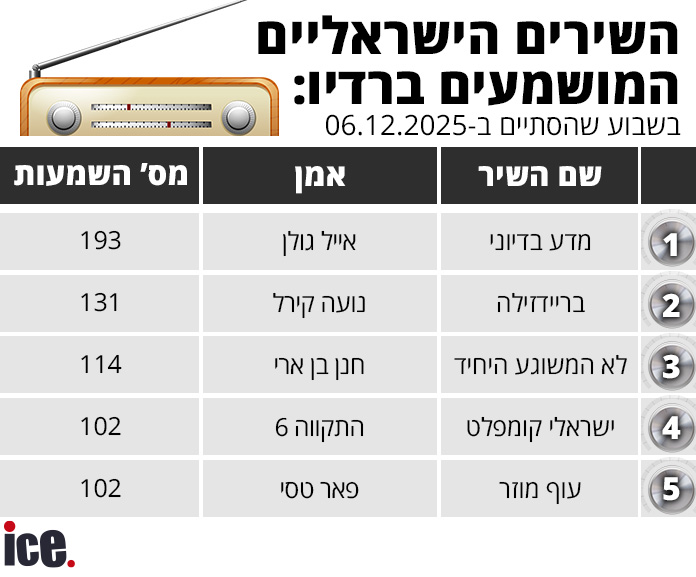 בראש רשימת השירים המובילים השבוע נשאר השיר "מדע בדיוני" של אייל גולן עם 193 השמעות, אפילו יותר משבוע שעבר. במקום השני "בריידזילה" של נועה קירל עם 131 השמעות (כמעט שלושים השמעות פחות משבוע שעבר). במקום השלישי שירו של חנן בן ארי "לא המשוגע היחיד" עם 114 השמעות. למקום הרביעי יורד "ישראלי קומפלקט" של התקווה 6 עם 102 השמעות, בתיקו עם השיר "עוף מוזר" של פאר טסי, עם 102 השמעות.
