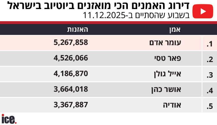 עומר אדם ממשיך לשמור על מקומו בפסגת האמנים המושמעים ביותר ביוטיוב ישראל. לא פחות מ-5.2 מיליון פעמים הושמעו שיריו של הזמר. במקום השני נמצא גם השבוע פאר טסי עם מספר יוצא דופן של 4.52 מיליון השמעות.