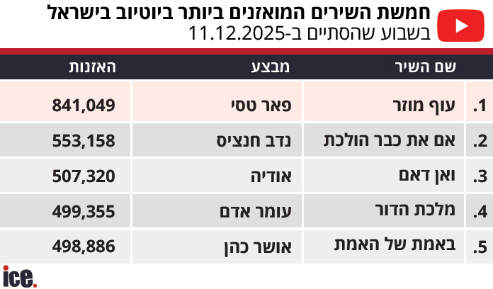 גם השבוע מוביל עומר אדם את רשימת האמנים המואזנים ביותר ביוטיוב ישראל, כאשר פאר טסי בעקבותיו, טסי שולט גם ברשימת השירים המושמעים ביותר כאשר לא פחות מ-841 אלף פעמים הושמע השיר "עוף מוזר"