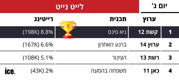קשת 12 ממשיכה את השליטה גם בגזרת הלייט נייט. "גיא פינס" פותח ברייטינג מוביל של 8.8% ו-198 אלף צופים. במקום השני, מוביל ערוץ 14 כשהתוכנית "ברגע האחרון" זוכה ל-6.6% רייטינג ו-167 אלף צופים. "הצינור" ברשת 13 משיג 5.1% ו-108 אלף צופים. "משפחה בהסעה" בכאן 11 מגיע למקום האחרון עם 2% ו-43 אלף צופים.