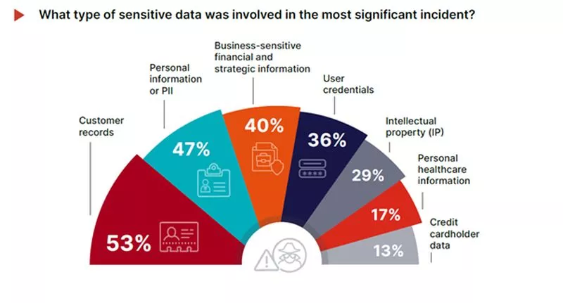 הדוח חושף גם את סוגי הנתונים הרגישים הנמצאים לרוב בסיכון. רשומות של לקוחות (53%) ומידע המאפשר זיהוי אישי (47%) נמצאים בראש הרשימה, אחריהם תוכניות רגישות עבור העסק (40%), פרטים מזהים של משתמשים (36%) וקניין רוחני (29%).