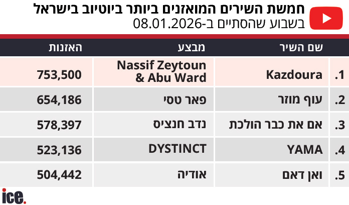 את רשימת השירים המואזנים ביותר פותח בדומה לשבוע שעבר השיר "Kazdoura" של נאסיף זייטון ואבו ווארד עם יותר 753 אלף האזנות. במקום השני, לא הרחק מהם, נמצא שירו האהוב של פאר טסי, "עוף מוזר", יורד במספר ההשמעות ומגיע ל-654,186 השמעות ביוטיוב. "אם את כבר הולכת" של נדב חנציס נמצא במקום השלישי עם יותר מ-578 אלף האזנות. את טבלת השירים סוגרים Yama של Dystinct ו"ואן דאם" של אודיה, כאשר שניהם עוברים את חצי מיליון ההשמעות ביוטיוב.