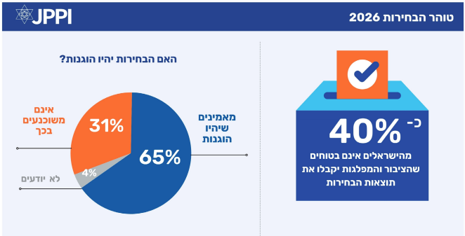 לקראת הבחירות בישראל שאמורות להתקיים בהמשך השנה, ממצאי מדד החברה הישראלית של המכון למדיניות העם היהודי (JPPI) מצביעים על אמון חלקי בלבד של הציבור בטוהר הבחירות ובקבלת תוצאותיהן.