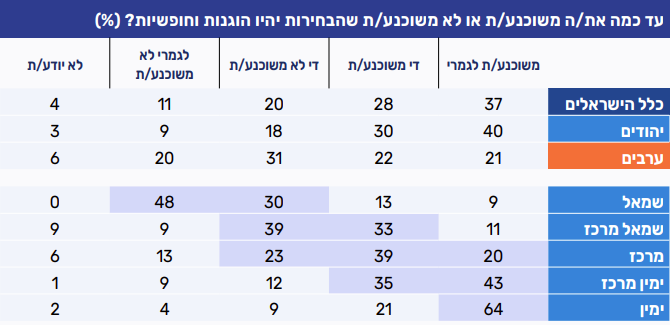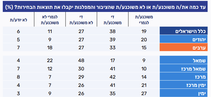 בקרב האזרחים הערבים רמת החשד גבוהה במיוחד: כ־51% מהם אינם משוכנעים שהבחירות יהיו הוגנות וחופשיות, בעוד שרק 43% מאמינים בטוהר הבחירות. בקרב היהודים, 70% מאמינים בטוהר הבחירות, ו-27% לא מאמינים.