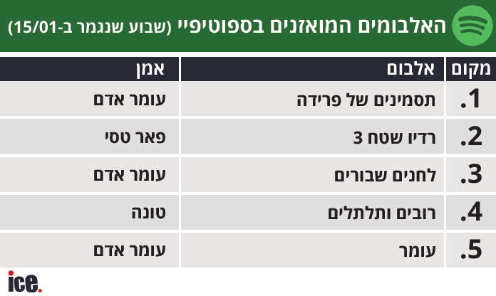 גם בגזרת האלבומים המואזנים בספוטיפיי, השליטה של עומר אדם היא מוחלטת. "תסמינים של פרידה", "לוחמים שבורים", ו"עומר", שלושתם נמצאים בחמשת האלבומים הנמשעים בסופטיפיי, כשהם מדורגים במקום הראשון, השלישי והחמישי בהתאמה. "רדיו שטח 3" של פאר טסי נמצא במקום השני, והאלבום "רובים ותלתלים" של טונה נמצא במקום הרביעי ברשימת האלבומים המואזנים השבוע בידי הישראלים. אלבומו של פאר טסי "רדיו שטח 2" נופל מחוץ לחמישיית האלבומים.