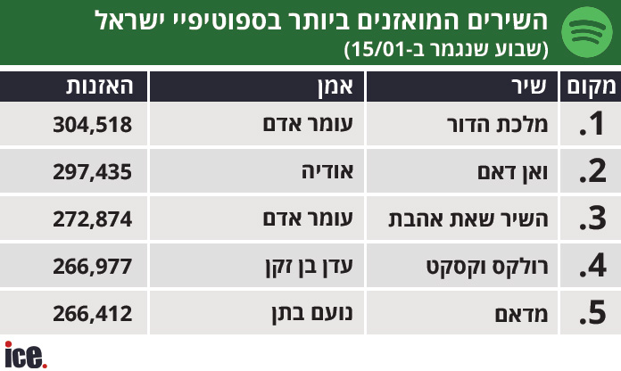 דירוג ספוטיפיי חושף את ההעדפות של הישראלים בשבוע האחרון, ומי שהפתיעה בדירוג יוטיוב האחרון, מצליחה להפתיע גם בדירוג השבועי של ספוטיפיי. עדן בן זקן, עולה למקום החמישי ברשימת הזמרים הנשמעים בספוטיפיי, כאשר לפניה נמצאים עומר אדם, פאר טסי, אודיה ואייל גולן.