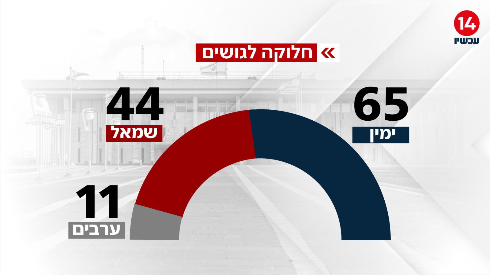במבט על חלוקת הגושים, ניתן להבחין כי גוש הימין השיג 65 מנדטים ואילו גוש השמאל קיבל 44 מנדטים. במקביל לכך, המפלגות הערביות עם 11 מנדטים בסך הכל.