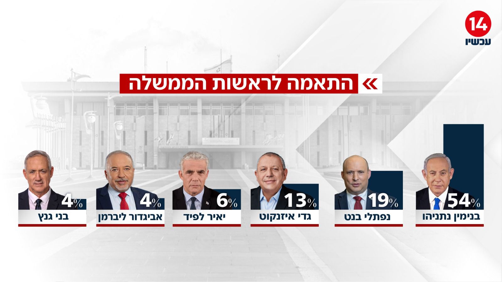 בשאלת ההתאמה לראשות הממשלה, נמצא כי בנימין נתניהו מוגדר כמנהיג הראוי ביותר לשמש בתפקיד. נתניהו נמצא עם 54% התאמה לשמש בתפקיד הבכיר. אחריו, מופיע נפתלי בנט עם 19% התאמה לכהן בתפקיד ראש הממשלה של מדינת ישראל.