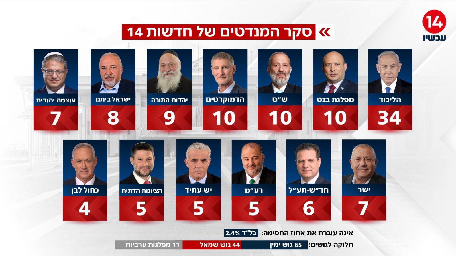 ברקע השיח רחב ההיקף על הבחירות הבאות, מהדורת החדשות של ערוץ 14 חשפה היום (חמישי) את תוצאות סקר המנדטים. הסקר נערך על ידי שלמה פילבר והוא כולל 503 בוגרים המהווים מדגם מייצג של כלל האוכלוסייה.