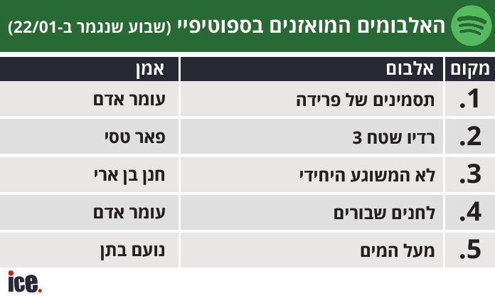 דירוג ספוטיפיי: מי האמן שהאזנתם לו הכי הרבה? איזה מהפך נרשם ברשימת השירים המושמעים ביותר? ומה האלבום החדש שנכנס לרשימה? | הדירוגים המלאים